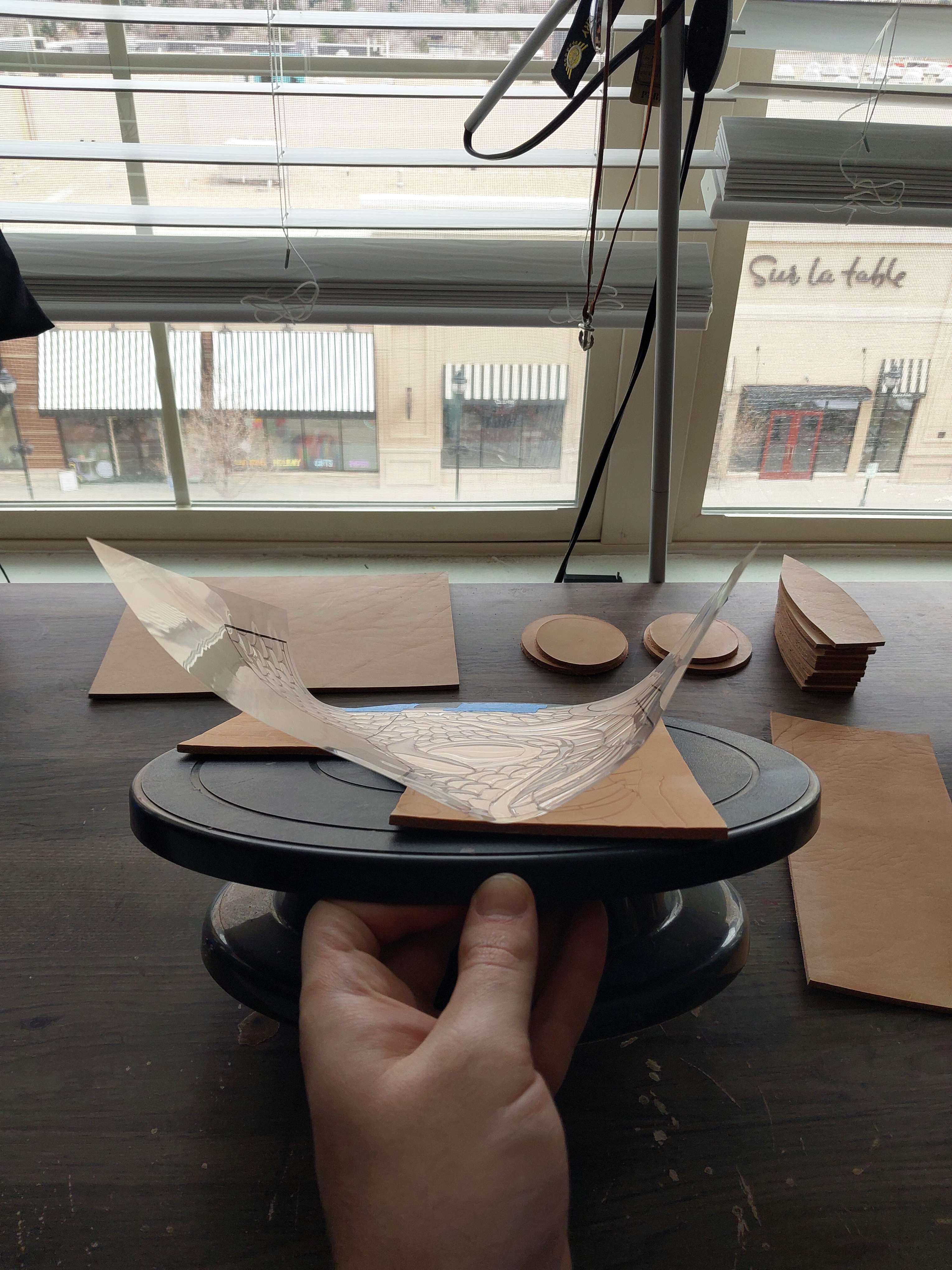 Discovered transparencies. They work really well as tracing paper, but a laser would still be far faster and easier on your fingers. Requires laser printing rather than inkjet for best results, though variants for both printing methods exist.